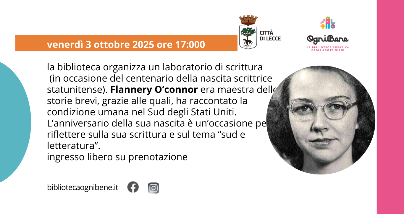 La biblioteca organizza un laboratorio di scrittura (in occasione del centenario della nascita scrittrice statunitense). Flannery O’connor era maestra delle storie brevi, grazie alle quali, ha raccontato la condizione umana nel Sud degli Stati Uniti. L’anniversario della sua nascita è un’occasione per riflettere sulla sua scrittura e sul tema “sud e letteratura”. il laboratorio sarà tenuto da Simona Cleopazzo (operatrice culturale). ingresso libero su […]