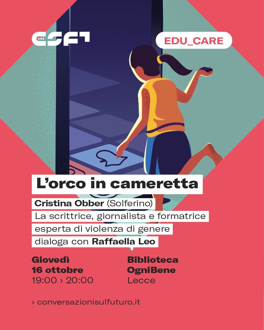 Presentazione del libro "L'orco in cameretta" di Cristina Obber (Solferino) Dietro la porta chiusa della loro cameretta, o semplicemente dietro lo schermo dello smartphone o del tablet, con chi stanno giocando, chattando, scambiando immagini i nostri figli? È una domanda che ci facciamo ogni giorno con crescente inquietudine, e con ragione. Perché il loro interlocutore […]