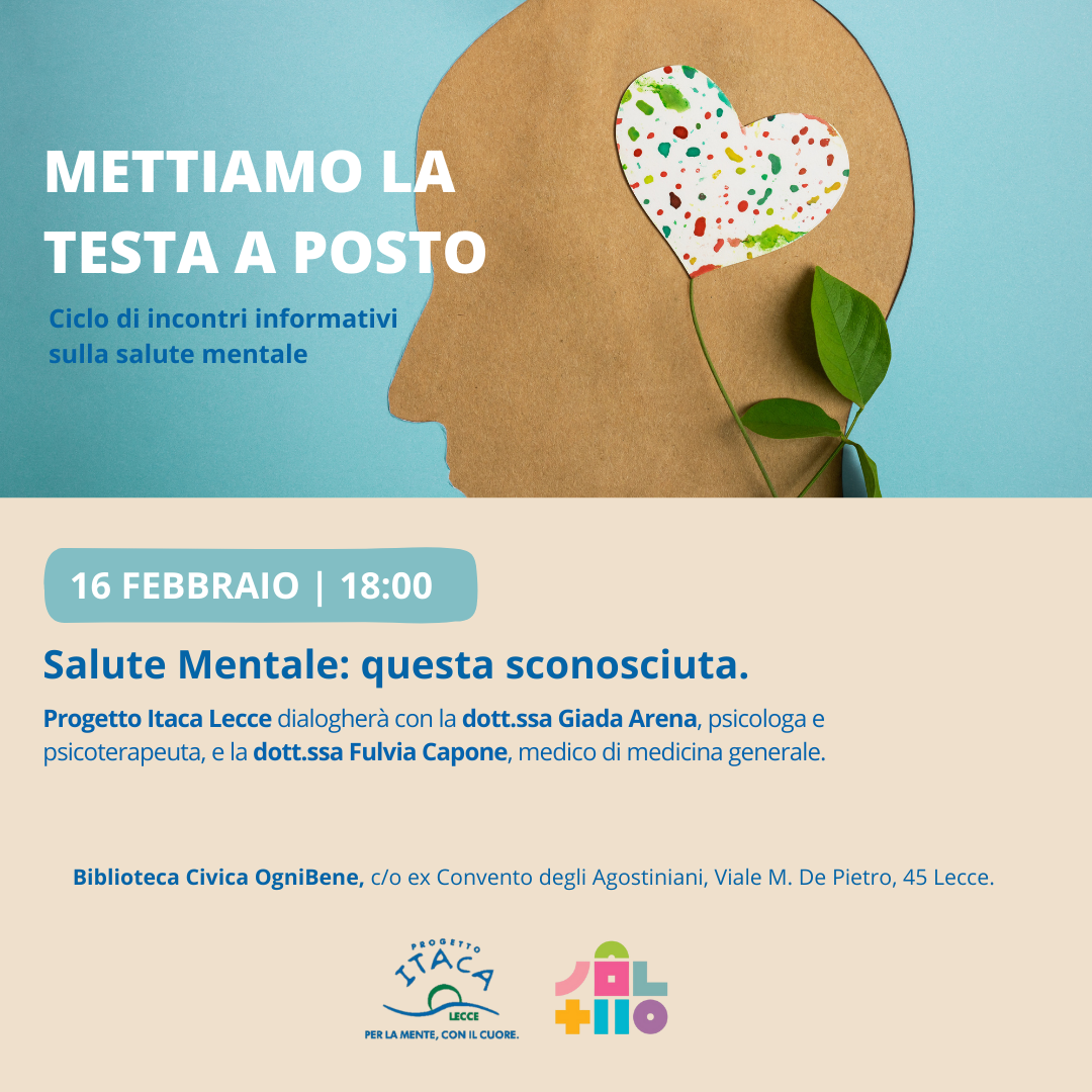 16 Febbraio 2024 ore 18:00 METTIAMO LA TESTA A POSTO - Salute mentale: questa sconosciuta Presentazione del Progetto Itaca Lecce ODV Relatori: Dott.ssa Giada Arena, Dott.ssa Fulvia Capone. Modera Marina Martano. Riparte la serie di seminari divulgativi con questo titolo organizzata da Progetto Itaca Lecce in cui esplorare gli aspetti meno approfonditi della salute mentale […]